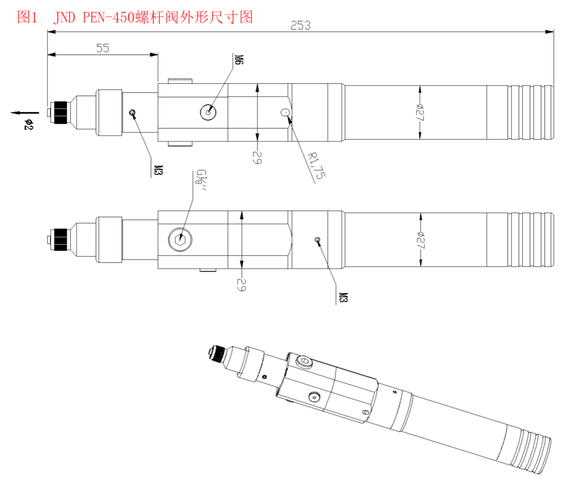設(shè)備本體尺寸:①螺桿閥: 253(L)mm×33 (φ)mm(具體尺寸見(jiàn)圖1)