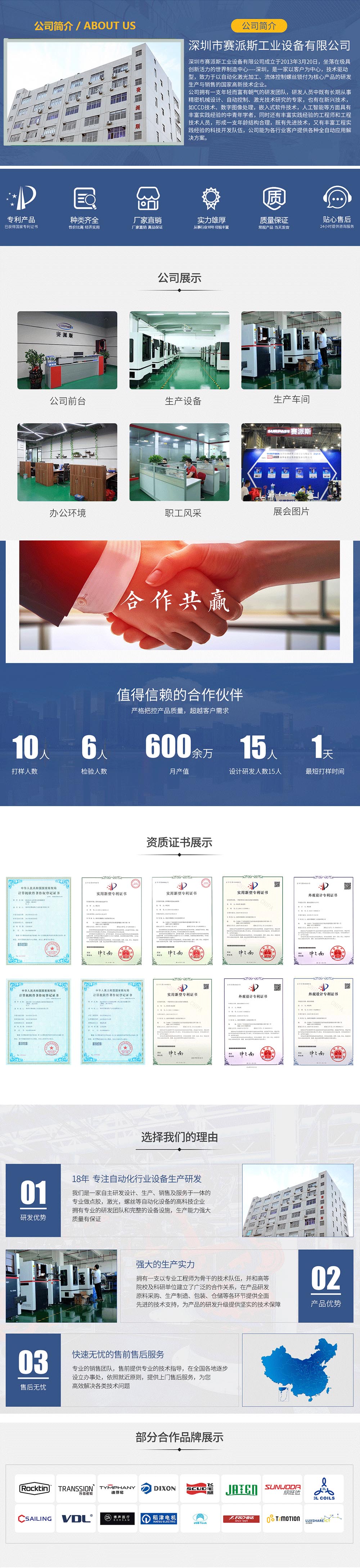 深圳市賽派斯工業(yè)設(shè)備有限公司成立于2013年3月20日,坐落在極具創(chuàng)新活力的世界制造中心----深圳,是一家以客戶為中心,技術(shù)驅(qū)動型,致力于以自動化激光加工、流體控制,螺絲鎖付為核心產(chǎn)品的研發(fā)、生產(chǎn)與銷售的國家高新技術(shù)企業(yè)。